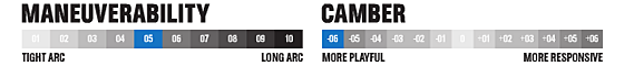 • Flex 5 w skali 10 punktowej. Deska jest średnio miękka co pomaga w jeździe na rurkach i generalnie jibingu. Do tego jazda po stoku staje się prostsza, szczególnie dla osób o słabszych umiejętnościach
