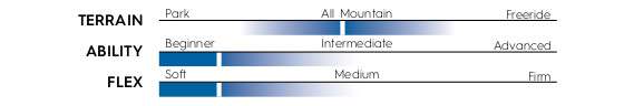 Flex: ŚredniaFlex czyli sztywność deski ogromnie wpływa na jej stabilność i prowadzenie. W dużym uproszczeniu - średnie deski zapewniają dobrą stabilność przy umiarkowanie dużych prędkościach i pozwalają na dużą swobodę ruchów podczas zabaw na stoku. |