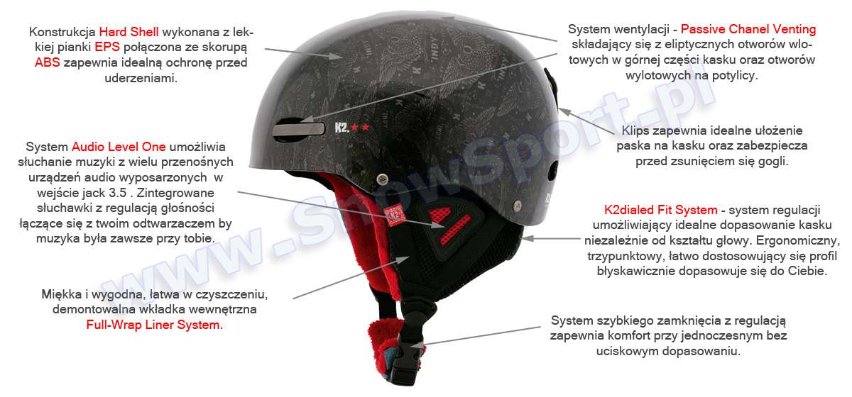 • Indy przypomina klasyczne kaski inspirowane skatingiem ze stylowymi dodatkami. Kask dobrze się dopasowuje, tworząc osłonę nad goglami, natomiast systemy K2dailed i FUll Wrap dają niezrównaną wygodę z możliwością dodatkowego dostosowania. Konstrukcja: