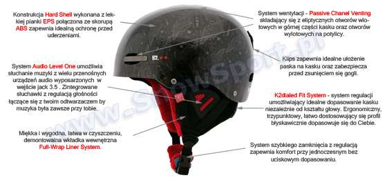 • Level 1 Baseline Audio System - System K2 Baseline Audio™ dostarczają muzykę do Twych uszu oraz/ lub synchronizacji z Twoim telefonem. Słuchawki wbudowane są w Baseline Audio Earpads w określonych kaskach K2. Umiejscowienie jest tak pomyślane, że nie zauważysz ich obecności dopóki nie włączysz muzyki. Jeżeli wolisz jeździć bez hałasu lub podłączonego telefonu, możesz łatwo wyjąć słuchawki z kasku. Nie ma potrzeby kupowania dodatkowych akcesoriów czy przejściówek dla Twojego sprzętu muzycznego lub telefonu, kiedy wszystko, czego potrzebujesz, dostarczone jest w kasku. System Baseline Audio występuje w trzech odmianach. W tym kasku zastosowany jest Poziom 1 Baseline Audio. Zintegrowane słuchawki i regulacja głośności łączące się z twoim odtwarzaczem by muzyka byłą przy tobie.