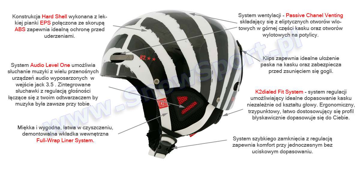 - Level 1 Baseline Audio System - System K2 Baseline Audio™ dostarczają muzykę do Twych uszu oraz/ lub synchronizacji z Twoim telefonem. Słuchawki wbudowane są w Baseline Audio Earpads w określonych kaskach K2. Umiejscowienie jest tak pomyślane, że nie zauważysz ich obecności dopóki nie włączysz muzyki. Jeżeli wolisz jeździć bez hałasu lub podłączonego telefonu, możesz łatwo wyjąć słuchawki z kasku. Nie ma potrzeby kupowania dodatkowych akcesoriów czy przejściówek dla Twojego sprzętu muzycznego lub telefonu, kiedy wszystko, czego potrzebujesz, dostarczone jest w kasku. System Baseline Audio występuje w trzech odmianach. W tym kasku zastosowany jest Poziom 1 Baseline Audio. Zintegrowane słuchawki i regulacja głośności łączące się z twoim odtwarzaczem by muzyka byłą przy tobie.