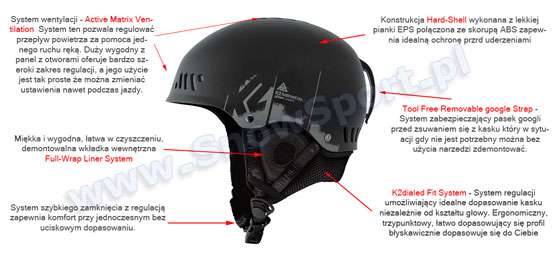 • K2dialed Fit System, - tworzy dopasowanie hełmu niezależnie od kształtu głowy. Ergonomiczny, trzypunktowy, łatwo dostosowujący się profil błyskawicznie dopasowuje się do Ciebie. Pozwala to osiągnąć wygodę dostosowania w locie. Efekt końcowy K2dialed Fit System idealne dopasowania kasku do Twoich potrzeb.