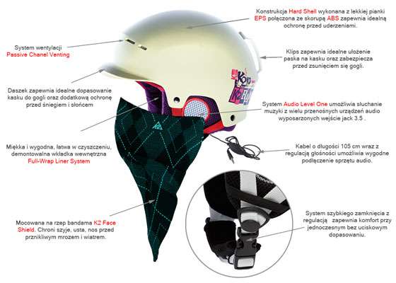 • Level 1 Baseline Audio System - System K2 Baseline Audio™ dostarczają muzykę do Twych uszu oraz/ lub synchronizacji z Twoim telefonem. Słuchawki wbudowane są w Baseline Audio Earpads w określonych kaskach K2. Umiejscowienie jest tak pomyślane, że nie zauważysz ich obecności dopóki nie włączysz muzyki. Jeżeli wolisz jeździć bez hałasu lub podłączonego telefonu, możesz łatwo wyjąć słuchawki z kasku. Nie ma potrzeby kupowania dodatkowych akcesoriów czy przejściówek dla Twojego sprzętu muzycznego lub telefonu, kiedy wszystko, czego potrzebujesz, dostarczone jest w kasku. System Baseline Audio występuje w trzech odmianach. W tym kasku zastosowany jest Poziom 1 Baseline Audio. Zintegrowane słuchawki i regulacja głośności łączące się z twoim odtwarzaczem by muzyka byłą przy tobie.