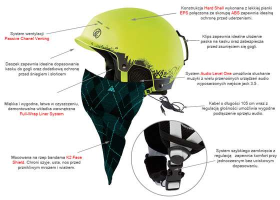 • Level 1 Baseline Audio System - System K2 Baseline Audio™ dostarczają muzykę do Twych uszu oraz/ lub synchronizacji z Twoim telefonem. Słuchawki wbudowane są w Baseline Audio Earpads w określonych kaskach K2. Umiejscowienie jest tak pomyślane, że nie zauważysz ich obecności dopóki nie włączysz muzyki. Jeżeli wolisz jeździć bez hałasu lub podłączonego telefonu, możesz łatwo wyjąć słuchawki z kasku. Nie ma potrzeby kupowania dodatkowych akcesoriów czy przejściówek dla Twojego sprzętu muzycznego lub telefonu, kiedy wszystko, czego potrzebujesz, dostarczone jest w kasku. System Baseline Audio występuje w trzech odmianach. W tym kasku zastosowany jest Poziom 1 Baseline Audio. Zintegrowane słuchawki i regulacja głośności łączące się z twoim odtwarzaczem by muzyka byłą przy tobie.