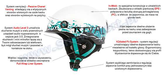 - K2dialed Fit System - tworzy dopasowanie hełmu niezależnie od kształtu głowy. Ergonomiczny, trzypunktowy, łatwo dostosowujący się profil błyskawicznie dopasowuje się do Ciebie. Pozwala to osiągnąć wygodę dostosowania w locie. Efekt końcowy K2dialed Fit System idealne dopasowania kasku do Twoich potrzeb.