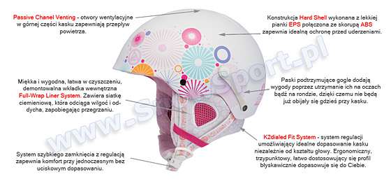- K2dialed Fit System - system regulacji umożliwiający idealne dopasowanie kasku niezależnie od kształtu głowy. Ergonomiczny, trzypunktowy, łatwo dostosowujący się profil błyskawicznie dopasowuje się do Ciebie. Pozwala to osiągnąć wygodę dostosowania w locie. Efekt końcowy K2dialed Fit System idealne dopasowania kasku do Twoich potrzeb.