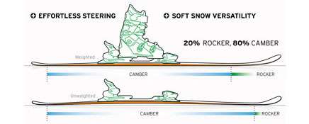 Łatwiejsze sterowanie oraz zwiększone unoszenie w puchu. W każdym modelu umieściliśmy dokładnie dobraną długość rockera tak aby zapewnić maksymalne osiągi na wszystkich poziomach umiejętności. Sterowanie nartami stało się łatwiejsze dla każdego oraz zwiększyła się uniwersalność w miękkim śniegu.