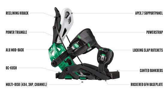 | APEX.7 Regulowany w 4 płaszczyznach tylny panel łyżki o anatomicznym kształcie zaprojektowanym z uwzględnieniem biomechaniki wiązania. Wykonany jest z aluminium i kompozytu uretanowego dzięki czemu zapewnia komfort i doskonały czas reakcji. |